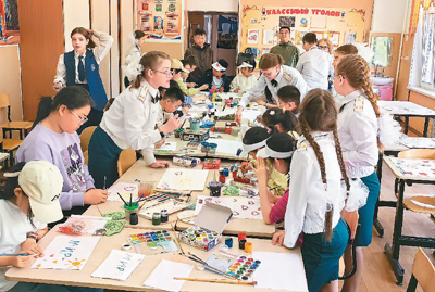 近日,黑龙江省黑河市第六小学教育集团赴俄罗斯布拉戈维申斯克第六学校开展文化交流。交流期间,中国学生体验了俄罗斯的课堂文化,双方增进了对彼此文化的了解;操场上,两国学生载歌载舞,通过音乐和舞蹈进一步加深了友谊。图为中俄两国学生一起绘画。