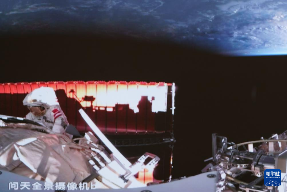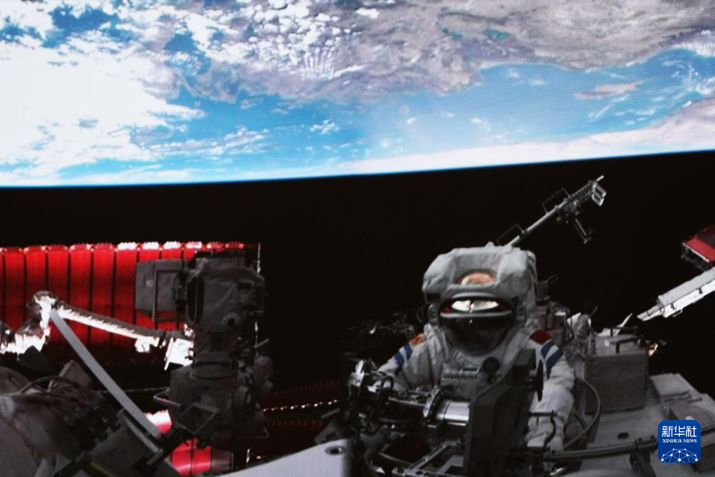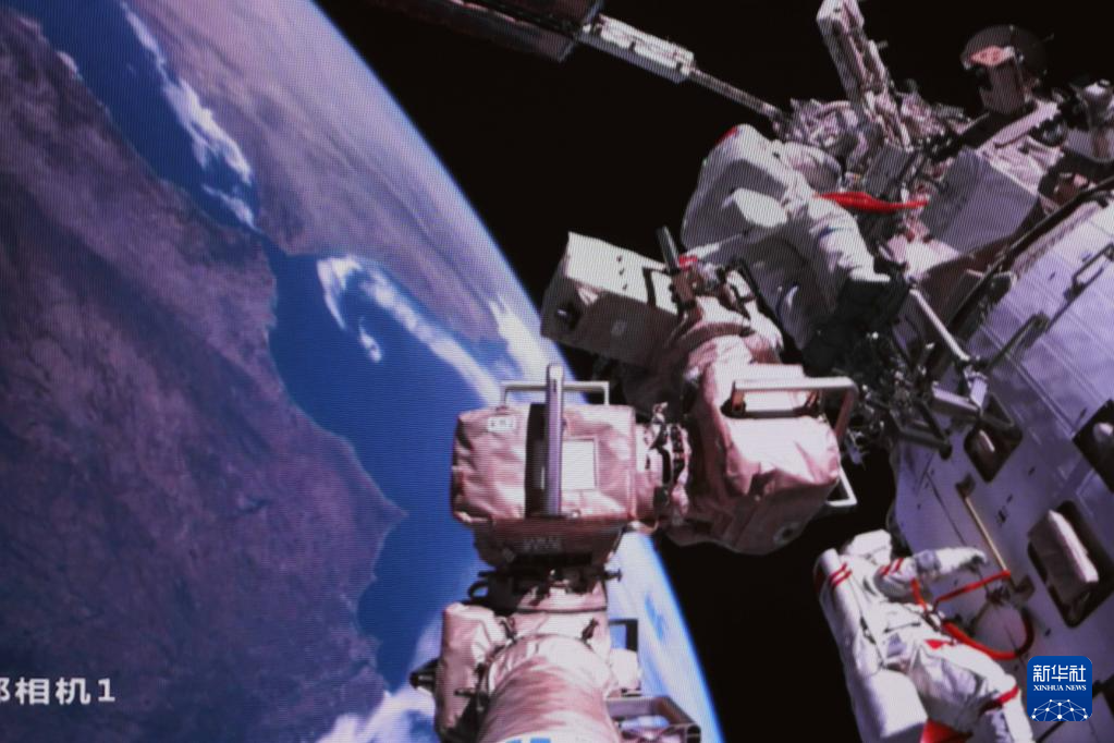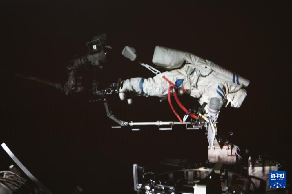 7月3日在北京航天飞行控制中心拍摄的神舟十八号航天员李聪在舱外工作的画面。新华社记者 郭中正 摄