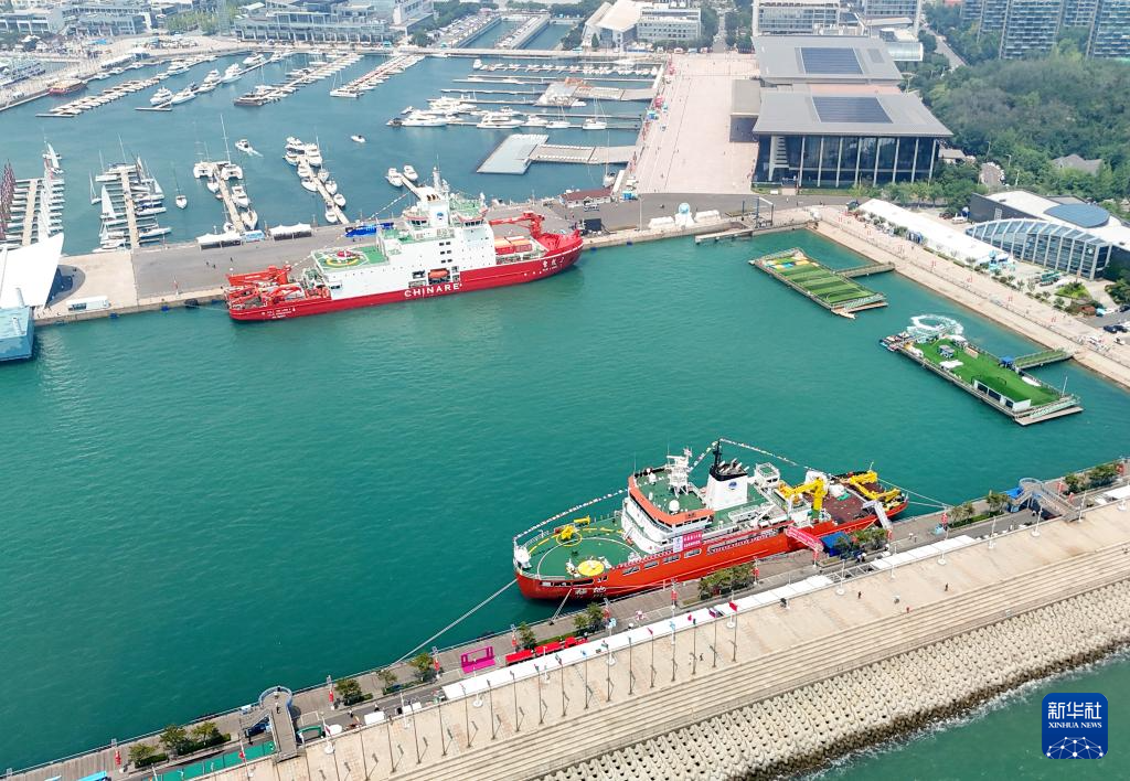 7月3日,“雪龙2”号科考破冰船和“极地”号破冰调查船靠泊在青岛奥帆中心码头(无人机照片)。新华社发(张进刚摄)