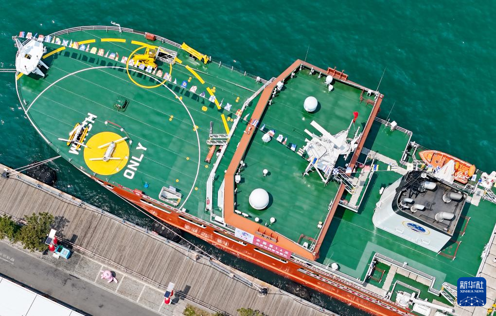 7月3日,“极地”号破冰调查船靠泊在青岛奥帆中心码头(无人机照片)。新华社发(张进刚摄)