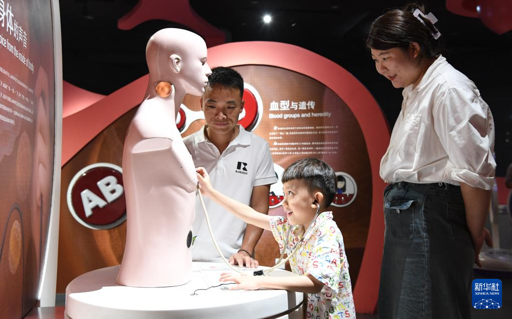 7月12日,小朋友在安徽省合肥市科技馆(黄山路馆区)体验人体声音科普设备。