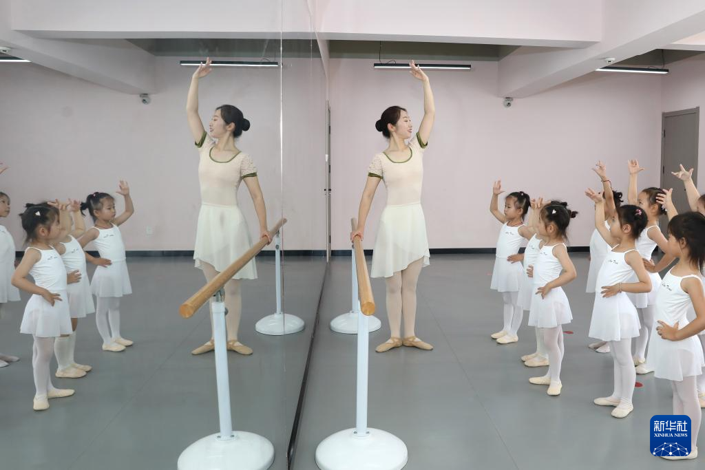 7月12日,在江苏省淮安市洪泽区一家舞蹈培训中心,孩子们在老师的指导下练习舞蹈基本功。新华社发(殷潮摄)