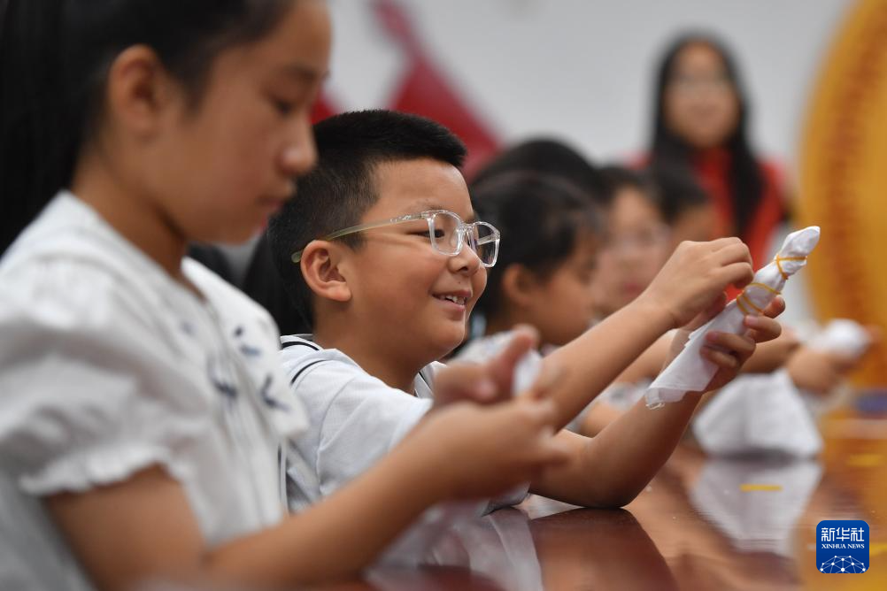 7月12日,在山东省青岛市城阳区红岛街道宁家社区开展的大学生志愿服务公益课堂上,小朋友在学习捆扎布料。新华社发(王海滨摄)