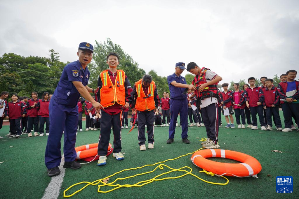 7月12日,在贵州省黔东南苗族侗族自治州丹寨县扬武中学,消防员指导学生正确穿着救生衣。新华社发(杨武魁摄)