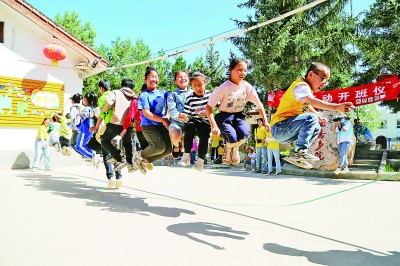 甘肃定西市,孩子们参加乡村夏令营的跳绳比赛。新华社发