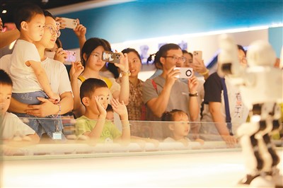 小朋友和家长在江苏扬州科技馆内观看机器人跳舞。