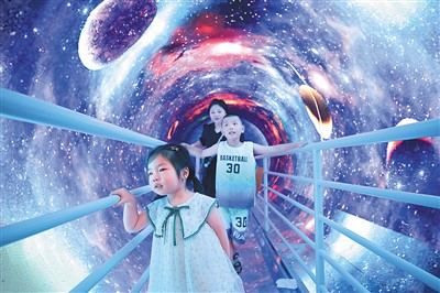 小朋友在福建厦门科技馆体验“时光隧道”。