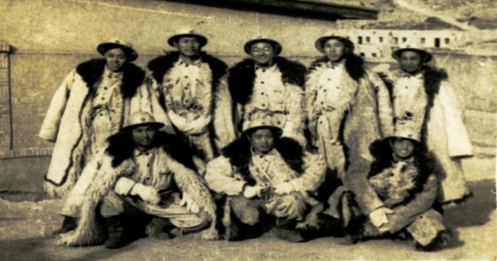 1951年在玉门油矿高地住所穿老羊皮工作服合影(前排右一为方华灿)。新华社发