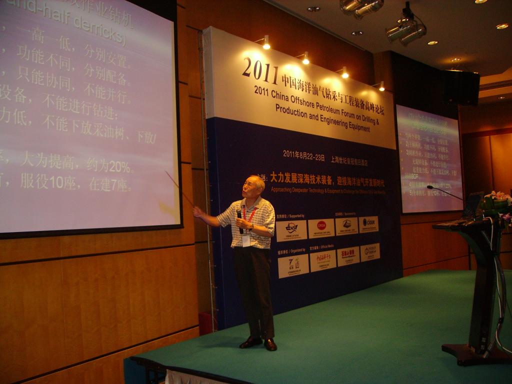 2011年,方华灿在上海参加中国海洋油气钻采与工程装备高峰论坛时作学术报告。新华社发
