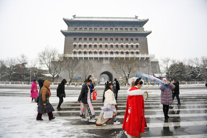 游客行走在雪后的正阳门箭楼前(2023年12月14日摄)。新华社记者 鞠焕宗 摄