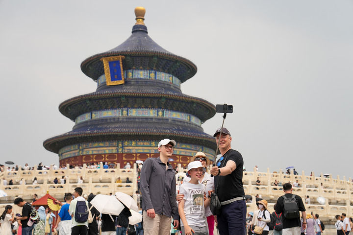 四名来自瑞士的游客在北京天坛公园祈年殿前合影(2024年7月9日摄)。新华社记者 鞠焕宗 摄