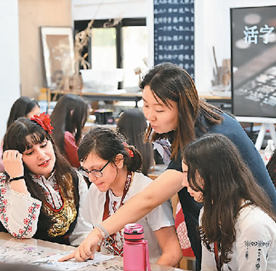 营员们通过课程学习、中国传统文化体验等活动,提升中文水平、了解中国文化。图为外国学生在了解中国文化。