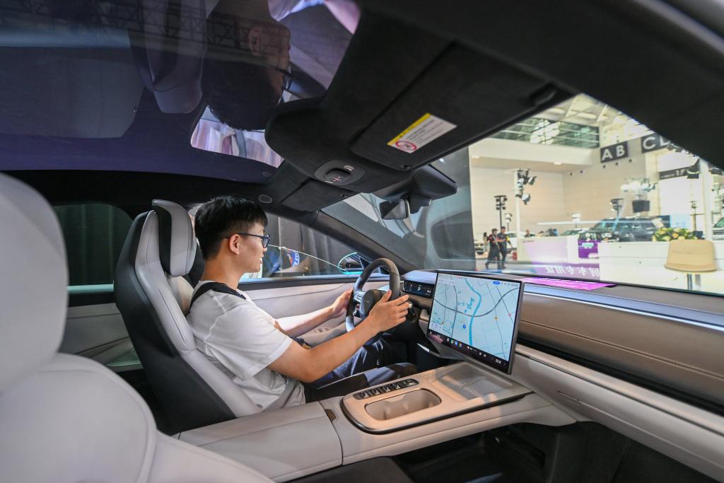 2024年6月22日,观众在天津举行的2024世界智能产业博览会现场静态体验一款智能网联电动汽车。新华社记者孙凡越摄