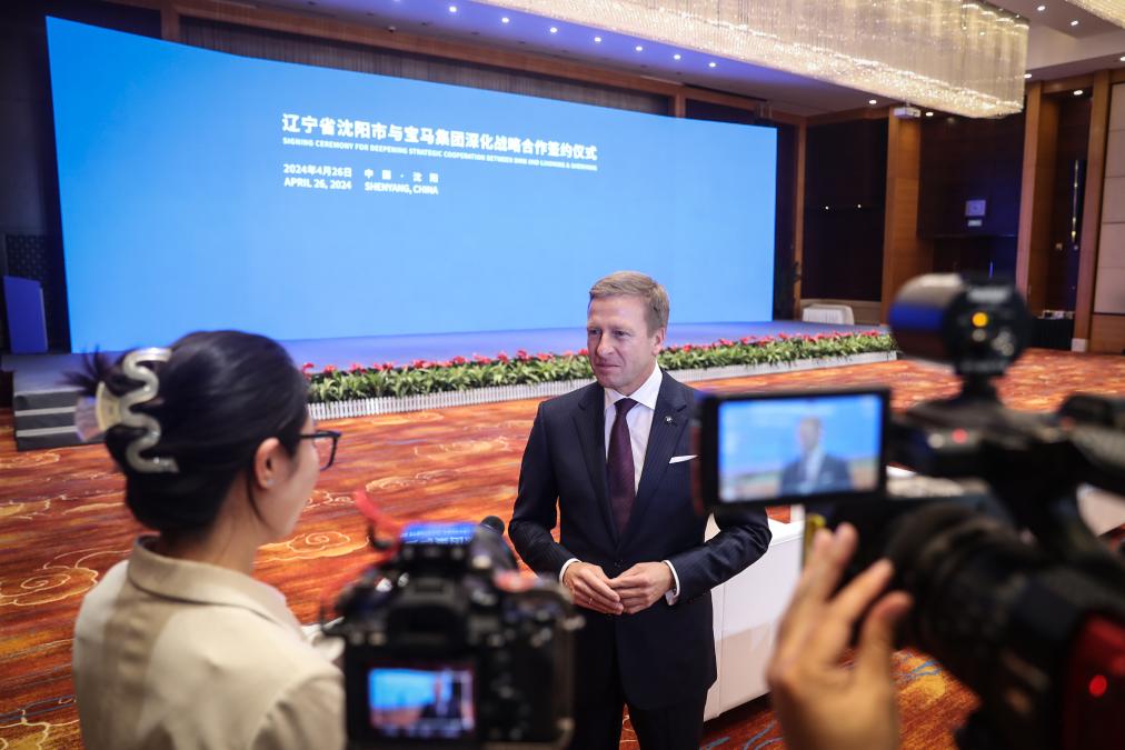 2024年4月26日,宝马集团董事长齐普策在辽宁省沈阳市与宝马集团深化战略合作签约仪式现场接受采访。新华社记者潘昱龙摄
