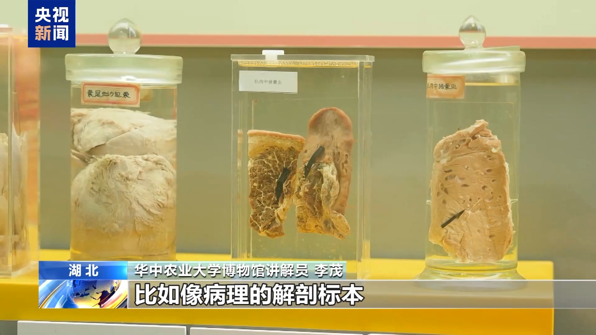 华中农业大学博物馆讲解员 李茂:在这边可以看到更加具有农业院校背景和我们学科特色的展品,比如像病理的解剖标本。这边就是我们馆的珍藏标本之一,马的半只解剖干制标本,这边一侧可以看到相对完整的外貌,在另外一侧展出的是马解剖之后的内部结构。每年都会有动科动医专业的学生来此上课,观众也可以在此更加直观地观摩到高校的教学科研的成果。