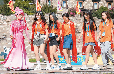 四川集结营的营员在四川省阿坝藏族羌族自治州茂县中国古羌城体验羌族萨朗舞。