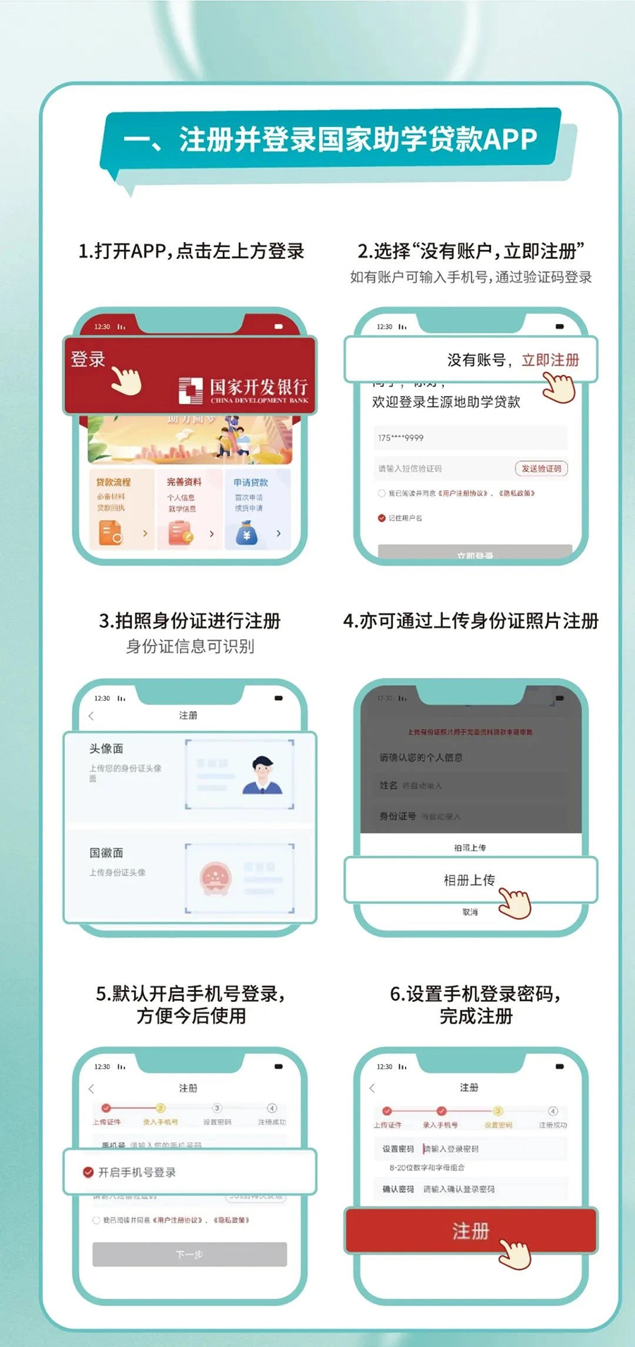 5.温馨提示:①部分地区可能会要求提供身份证正反面复印件一份,请提前向县级学生资助管理部门咨询,县级学生资助管理部门可提供申贷材料扫描上传服务;②如果借款学生及共同借款人户口不在同一本户口簿上,需携带双方户口簿原件。