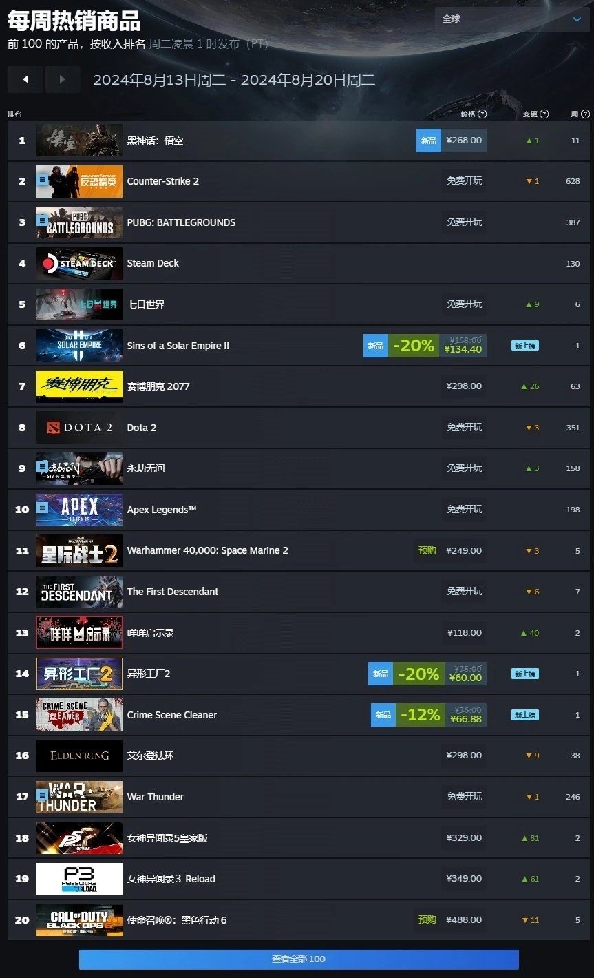据Steam8月13日至20日当周游戏销量榜,《黑神话:悟空》预购就已登顶全球榜首。《黑神话:悟空》的故事线设定在西天取经成功后,斗战胜佛孙悟空销声匿迹,玩家以第一视角扮演“天命人”决定冒险追寻其足迹。