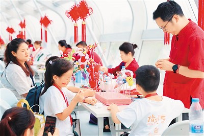 活动期间,国家速滑馆还在会场外设立非遗市集板块。传统插花、曹氏风筝、面塑、景泰蓝制作、泥人张、刺绣、花丝镶嵌等20余项国家级、市级、区级非遗项目齐聚“冰丝带”。非遗传承人在市集上展示丰富的传统技艺,为全国各地小选手提供体验中华传统文化的窗口。