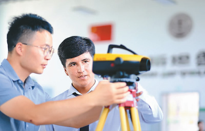 在塔吉克斯坦首都杜尚别的鲁班工坊,来自天津城市建设管理职业技术学院的老师(左)指导学生。