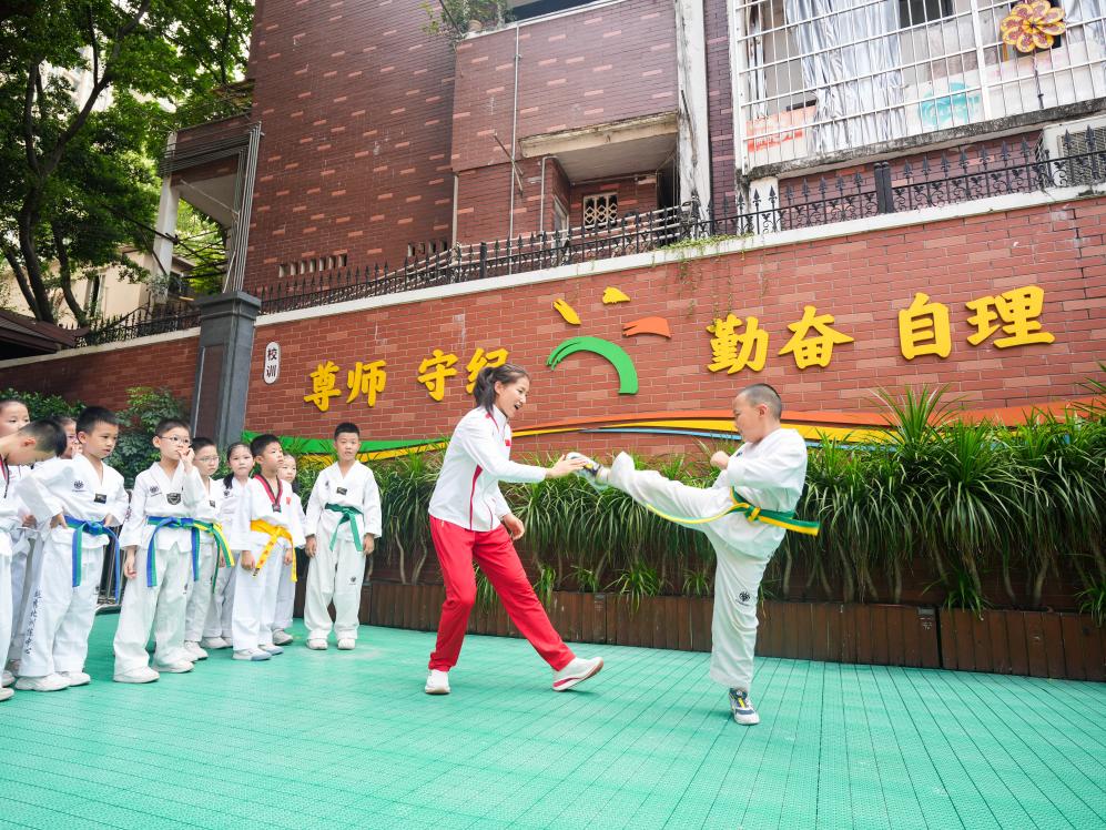 9月2日,巴黎奥运会跆拳道女子49公斤级银牌获得者郭清在广州市越秀区小北路小学与学生们互动。(钟涌 摄)