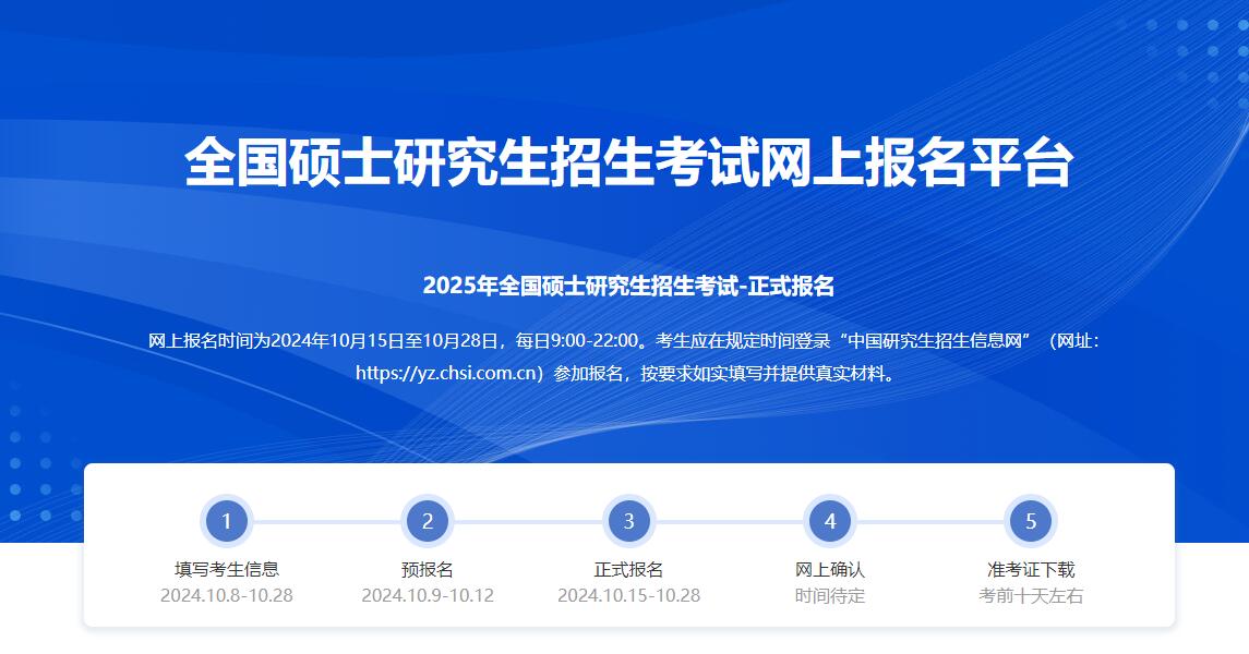 网上报名时间为2024年10月15日至10月28日(网上预报名时间为2024年10月9日至10月12日,相关工作安排由各省级教育招生考试机构确定并公布),每日9:00-22:00。考生应在规定时间登录“中国研究生招生信息网”(网址:https://yz.chsi.com.cn)参加报名,按要求如实填写并提供真实材料。