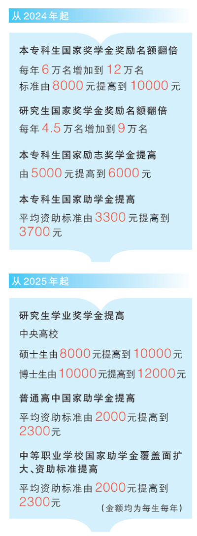 ——本专科生国家奖学金奖励名额翻倍,提高奖励标准。从2024年起,将本专科生国家奖学金奖励名额由每年6万名增加到12万名,奖励标准由每生每年8000元提高到10000元。