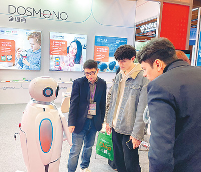 双猴科技展区展出的中文联盟全语通中文学习教育机器人吸引了不少观展者的目光。