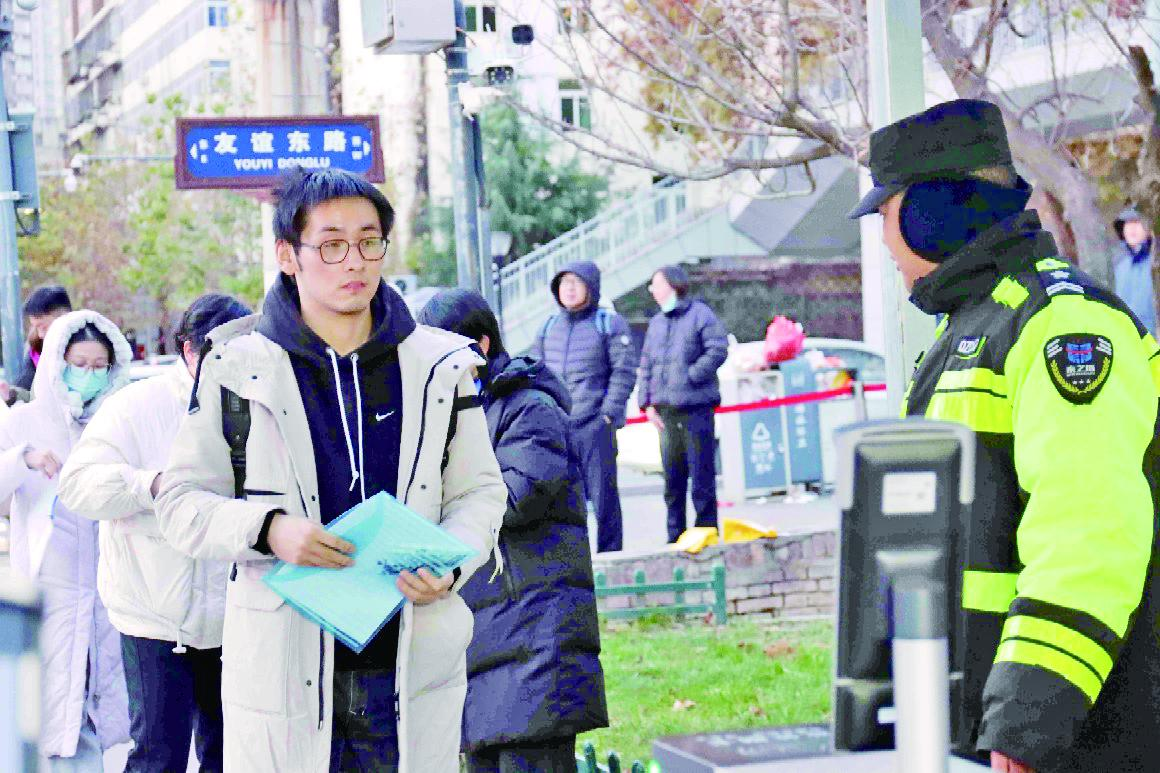 12月21日7时30分许,记者来到西安交通大学考点看到,虽然天气寒冷,但前来参加考试的学生精神抖擞,凭准考证有序进入考点,经过安检门检测后进入考场,考场外设置了考生随身物品存放点,方便考生寄存物品。