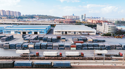 1月2日,一列满载新鲜果蔬的中老铁路国际货物列车从云南省昆明市王家营西站启程,驶向老挝。这标志着自2021年12月3日全线开通运营以来,中老铁路货物运输总量突破5000万吨大关,其中跨境货物1158万吨。跨境货物列车每日开行数量由开通初期的2列增加到目前的18列,列车牵引吨数由2000吨增至2500吨。2024年,中老铁路运输货物总量达1960万吨,日均保持在5万吨以上。图为列车正在装箱。