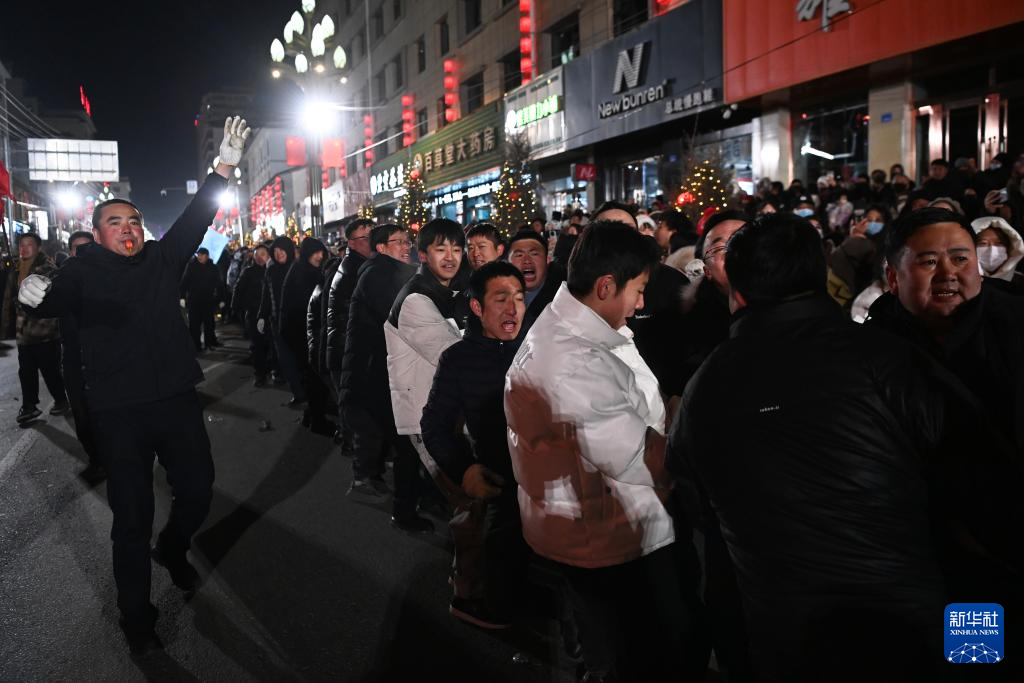 2月12日晚,在临潭县城关镇西大街,当地群众参加“万人扯绳”活动。新华社记者 范培珅 摄