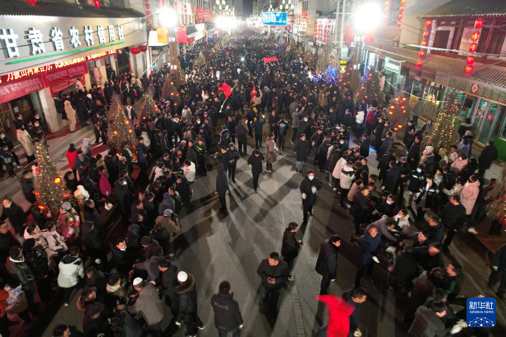 2月12日晚,在临潭县城关镇西大街,当地群众参加“万人扯绳”活动(无人机照片)。新华社记者 范培珅 摄