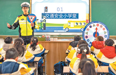 在江苏省泰州市海陵区九龙实验学校,交警向学生讲解交通出行安全知识。