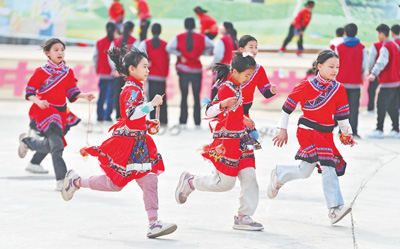 2月20日,广西壮族自治区梧州市长洲区倒水镇开展中小学校民族传统体育项目课堂交流活动,该镇师生在抛绣球、打陀螺、板鞋竞速等特色项目中感受民族传统体育的魅力。图为倒水镇富万村金桂广场上,富万小学学生参加抛绣球比赛。