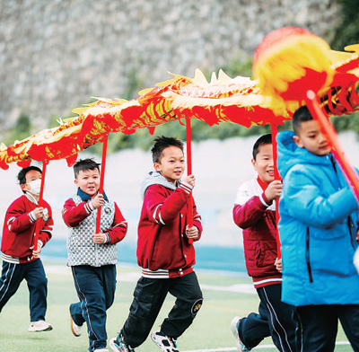 贵州贵阳云岩区人贵实验小学学生在课间体验舞龙。