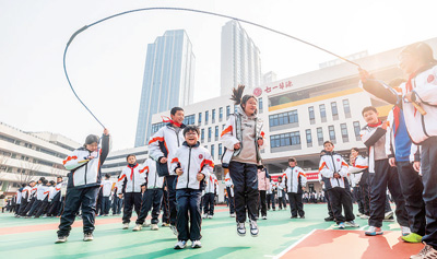 湖北武汉七一华源中学大课间上,学生们在跳绳。