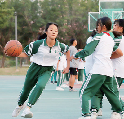广东广州培英中学学生在课间进行小规模篮球对抗赛。
