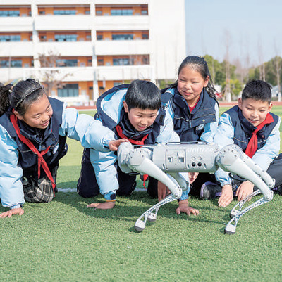 江苏昆山信义小学大课间上,学生们与机器狗互动。