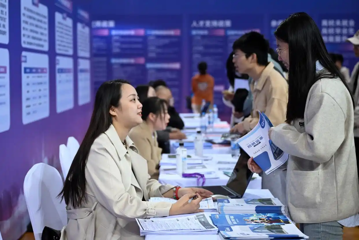 3月20日,环渤海城市联合招聘高校毕业生春季专场活动在天津职业技术师范大学启动,来自环渤海地区400多家企业提供岗位1.1万个。活动现场还设立就业服务台,为学生提供指导。图为当日,求职学生(右)和招聘方代表在招聘会现场交谈。新华社记者 赵子硕摄