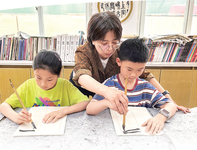 杭州春芽实验学校老师指导春假托管学生练习书法。