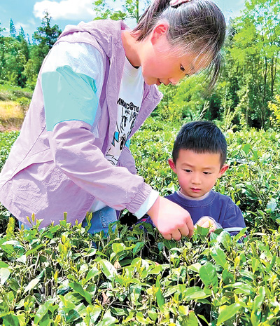 春假里,恩施州利川市一名中学生带着弟弟体验采茶。