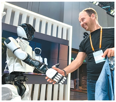 博览会上,星动纪元、宇树科技等企业生产的人形机器人与外国观众互动。