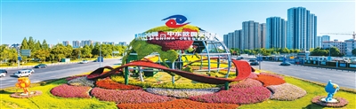 宁波市世纪大道上的“第四届中国—中东欧国家博览会”主题城市雕塑。