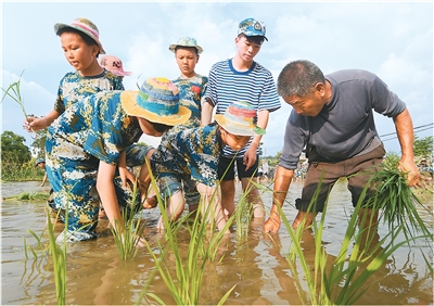 湖南省郴州市嘉禾县塘村镇增嘉村,小朋友参加“学农事 度暑假”夏令营社会劳动实践活动,在田间体验插秧。