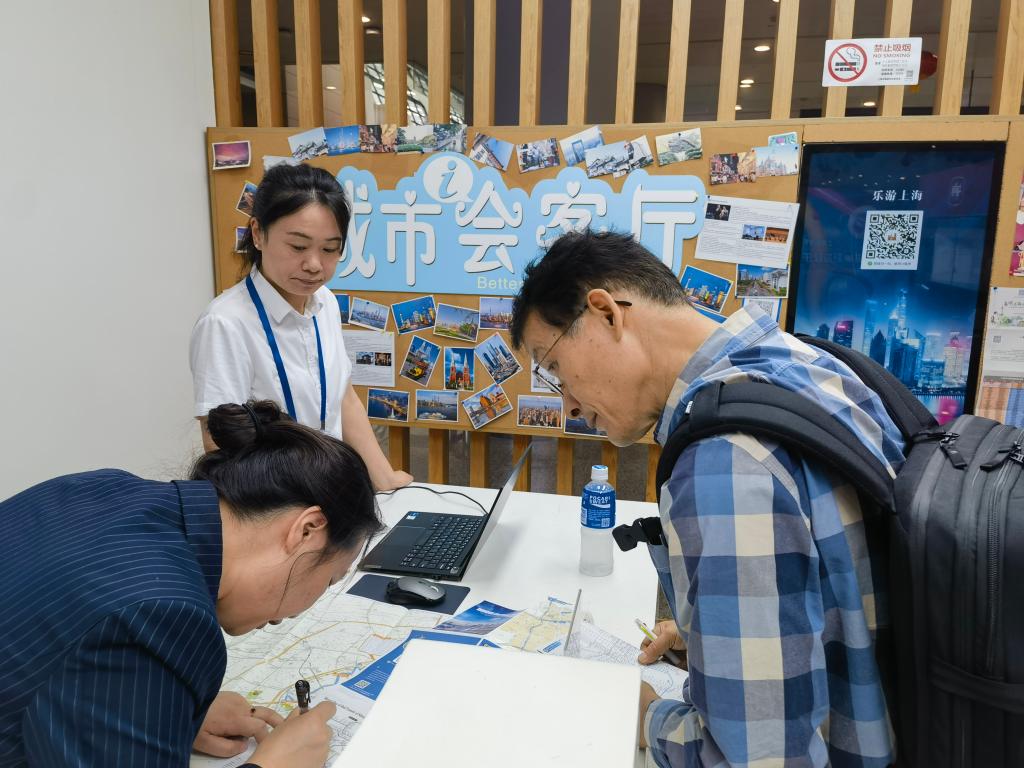 一名韩国游客在位于上海浦东机场的旅游咨询服务中心,向工作人员询问上海文旅信息。新华社记者 陈爱平 摄