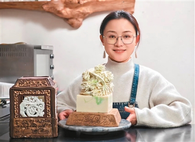 邹明磊与她制作的“传国玉玺”文物甜品。