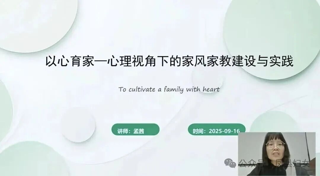 近日,凤县妇联在全县妇联系统举办凤县巾帼大讲堂(第十一期)“以心育家——心理视角下的家风家教建设与实践”线上讲座,特邀明朗心理金牌讲师、国家二级心理咨询师孟茜老师主讲,来自县、镇、村(社区)及三新领域各级妇联干部、执委共计390余人次聆听了讲座。
