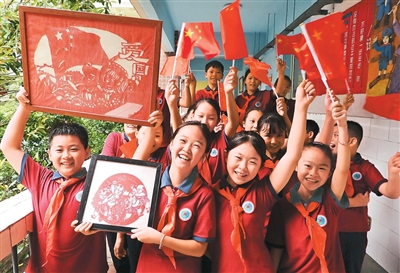 日前,四川省达州市开江县西城小学,学生们展示制作的“祝福祖国”创意剪纸作品,喜迎国庆。