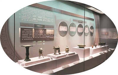 一组“小与大”的对比颇有意思。河南省安阳市文物考古研究院收藏的带盖小铜鼎是迄今发现最小的商代青铜鼎,高度和重量与一枚鸡蛋相当。小鼎上方的展板印有现存商代最大青铜鼎后母戊鼎(曾称司母戊鼎)的图片。据介绍,后母戊鼎的高度是带盖小铜鼎的26倍,重量是它的近1.7万倍。