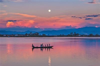 游客在云南大理洱源西湖赏月。
